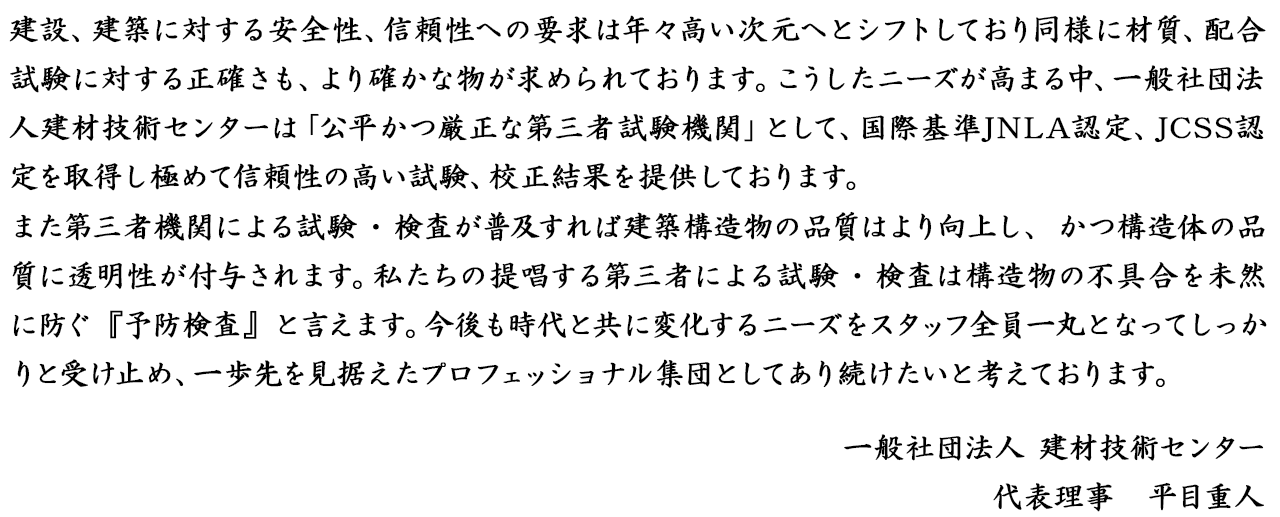 | 業務内容 | コンクリート管理試験業務、土質・材料・配合試験等の室内試験業務、現場施工管理試験業務、 パソコン用ソフトウェアの開発及び販売、工業用計測機器の校正、屋内・屋外試験機器のレンタル |